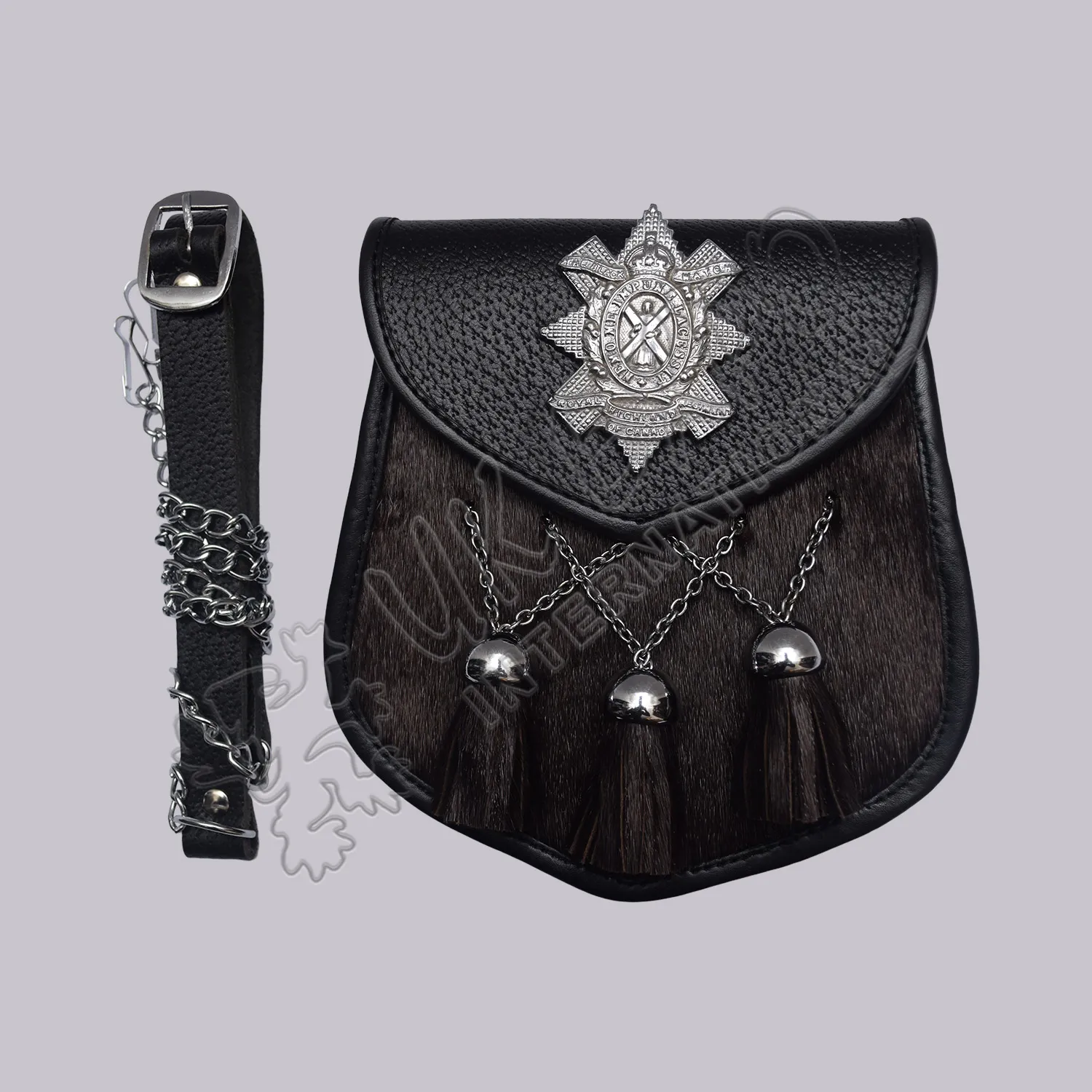 Black Watch Scottish Leather Semi Dress Sporran. A refined and heritage-inspired accessory ideal for semi-formal Highland wear. This sporran features beautifully realistic faux lynx fur paired with a black leather flap and a chrome Black Watch badge. Three black leather tassels with chain detailing and a matching strap complete its traditional yet distinctive design.