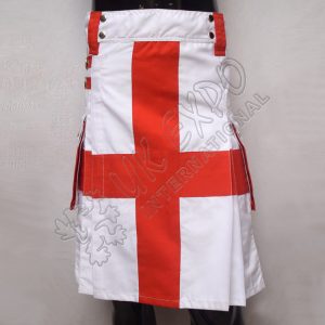 Canadian Maple Flag Hybrid Utility Kilt. This unique hybrid utility kilt combines national pride with modern functionality. Featuring the iconic Canadian Maple Flag design, it is crafted from washable Cotton PC fabric for durability and comfort. Designed with large cargo pockets and knife pleats, this kilt offers both style and practicality.