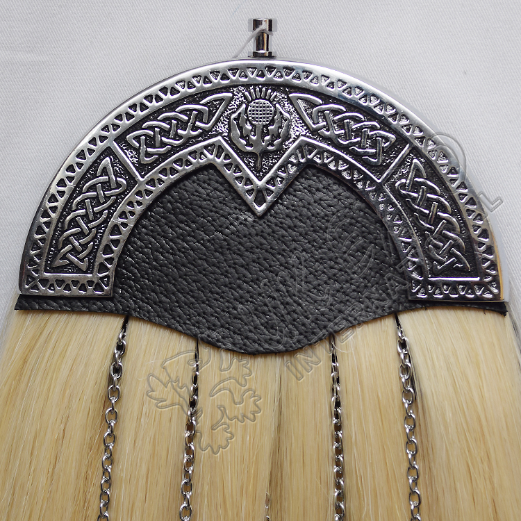 Chrome Thistle Cantle Diamond Horse Hair Sporran, is a perfect blend of elegance and tradition, making it an exceptional accessory for various occasions. This sporran features luxurious white horse hair paired with a chrome-plated diamond-shaped thistle cantle, complete with black color filling. With five black tassels and a belt and chain included, this sporran adds a touch of sophistication to any kilt outfit.