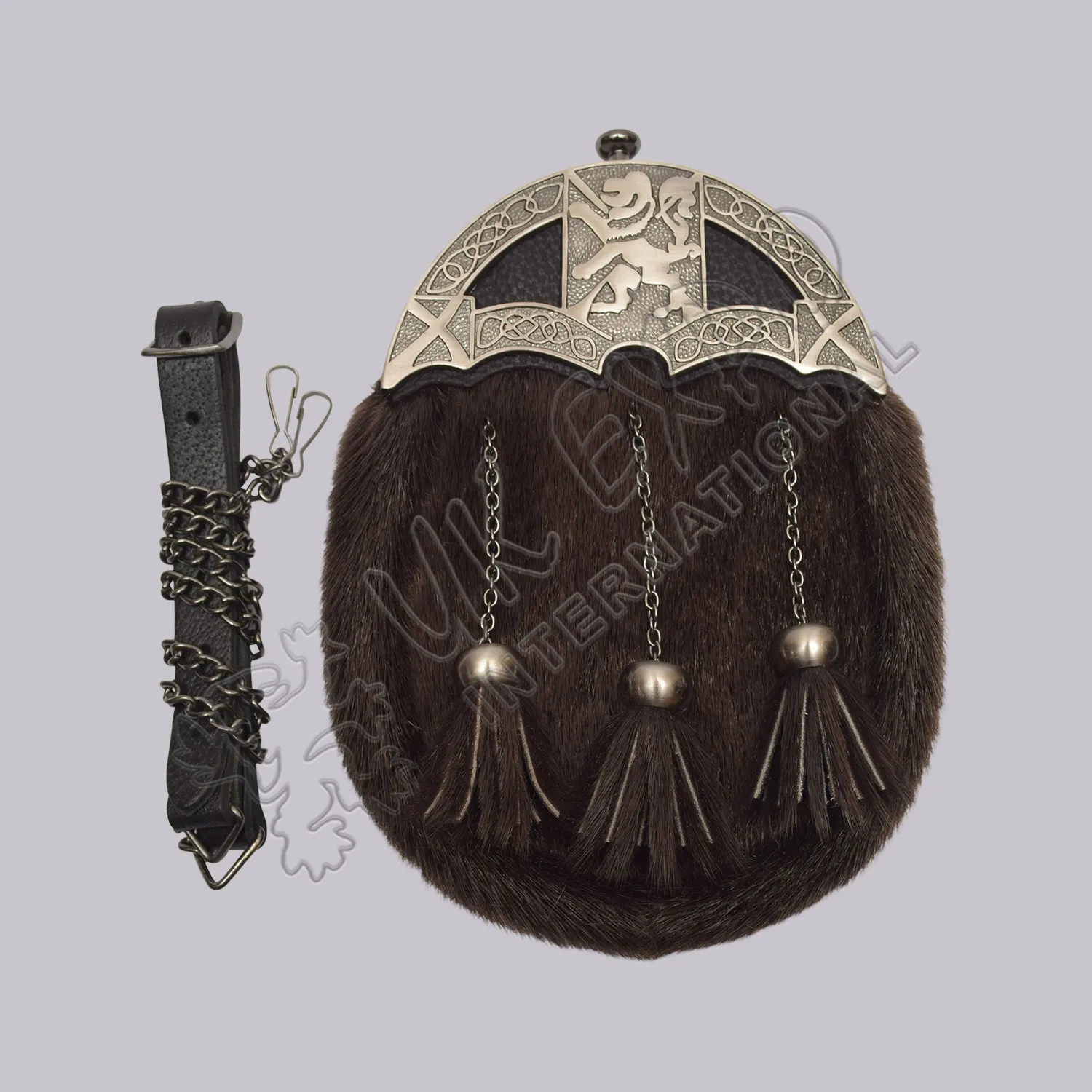 Dark Brown Seal Skin Rampant Lion Antique Cantle Sporran. A distinguished and heritage-rich accessory crafted for formal Highland wear. Made from rich dark brown seal skin, this sporran features an antique-style cantle embossed with the iconic Rampant Lion—symbol of Scottish pride and valor. Three matching tassels and a black leather strap with silver chain complete its bold and ceremonial design.