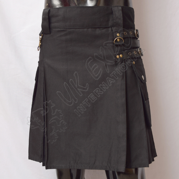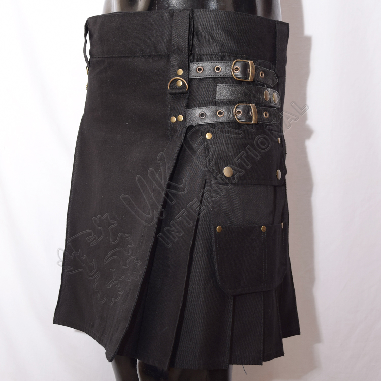 Ladies Black Heavy Duty Utility Kilt. Perfect for any occasion, this kilt offers a versatile and stylish design with high quality fabric and practical utility elements, including spacious side pockets, four secure straps, adjustable straps with snaps on both sides, and key chain hooks on the left side, it’s ideal for both casual and formal events. The kilt is designed with pleats at the back and a sleek, flat front flap, enhancing its classic appeal.
