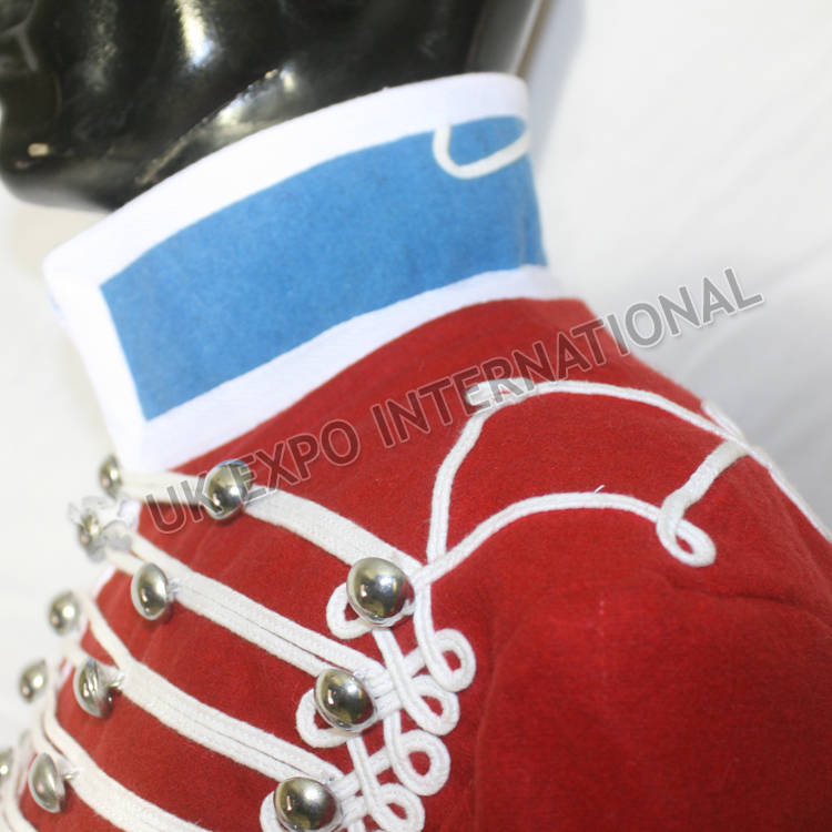 Red Hussar Jacket with White wool Braid Sky Blue collar and cuff with Silver Doom Buttons
