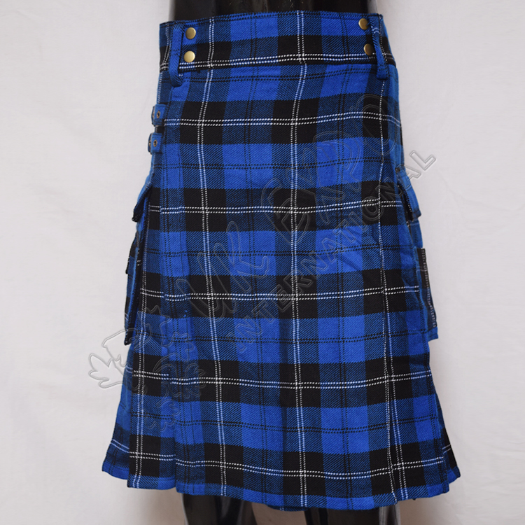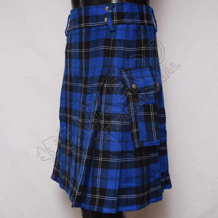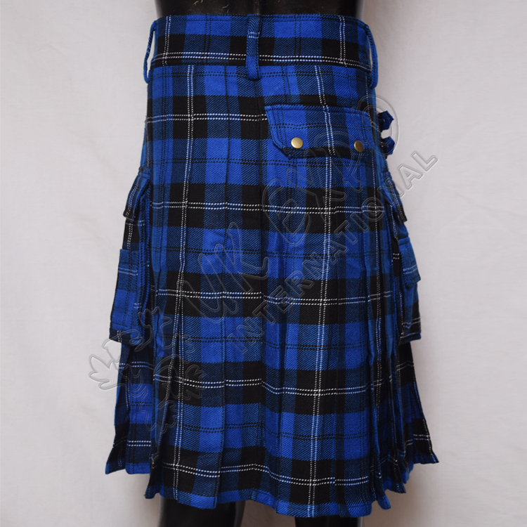 Royal Ramsay Blue Tartan Utility Kilt. This stylish and functional utility kilt combines traditional Scottish heritage with modern design elements. Unique Celtic metal parts on round shape pockets, this kilt is perfect for both casual wear and special occasions. Comfortable fit tailored to the male figure.