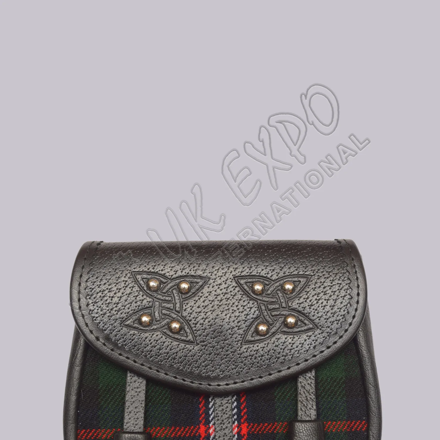 Stewart Hunting Modern Tartan Celtic Stud Daywear Sporran. A refined and heritage-inspired accessory crafted for everyday Highland wear. This sporran features a black leather flap adorned with Celtic embossing and a decorative stud, paired with three black leather tassels and a silver chain strap. Designed to complement Stewart Hunting Modern tartan ensembles, it blends tradition with understated style.